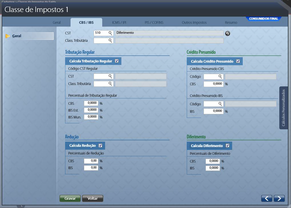É crucial que o contador da sua empresa revise e ajuste as configurações fiscais no sistema conforme o regime tributário, pois, com o auxílio da contabilidade, é preciso informar o tipo de tributação do IBS/CBS.